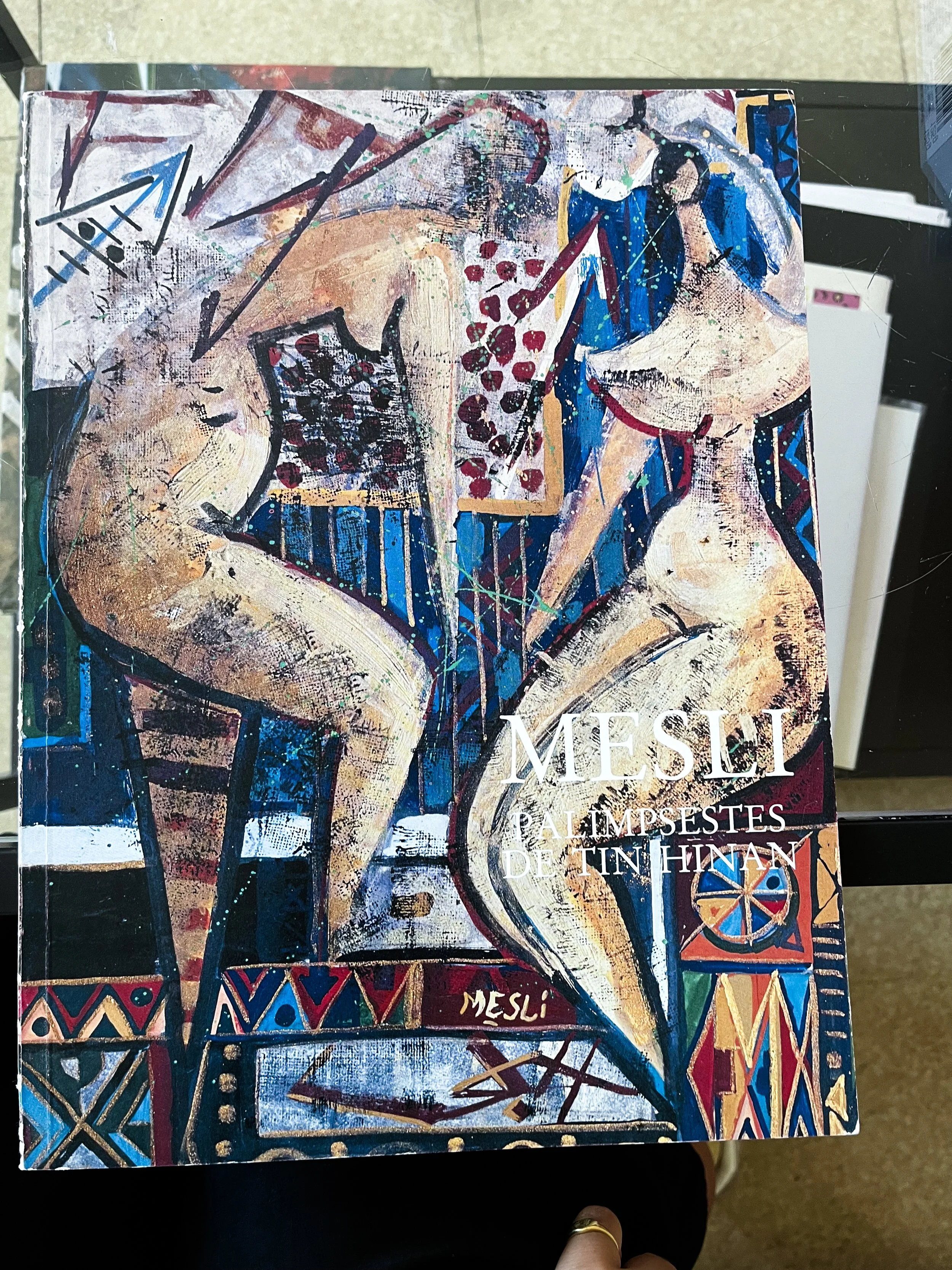 Welcomed by Tarik, Mesli’s fellow artist son, I step into his Nanterre abode, now inhabited solely by his widow, Annick. Every inch of the apartment reflects Mesli’s enduring presence: his gouaches cloak the walls, while cabinets display items from his trips, including Indigenous Kabyle and Tuareg objects whose decorative motifs often appear in Mesli’s own paintings (Fig. 2). The coffee table, bedecked with monographs and exhibition catalogs, transforms the living room into a miniature Mesli museum (Fig. 3). Meanwhile, a closed door conceals a room chock-a-block with his works packaged in cellophane.