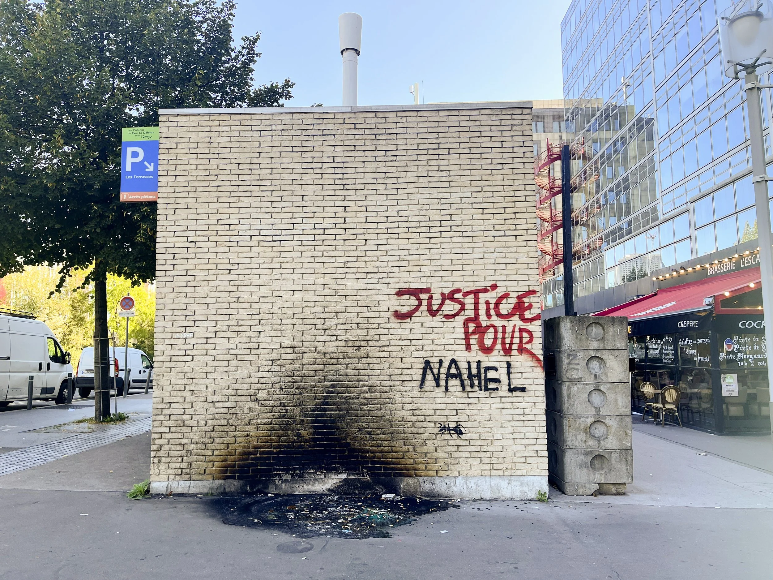 Nanterre. June 27, 2023. This multi-ethnic Parisian suburb witnessed a brutal murder that ignited a month-long civic upheaval. Nahel Merzouk, a 17-year-old of North African descent, was fatally shot at point-blank range by a police officer during a traffic check. As I walk from the Nanterre-Préfecture station months later, the gleaming glass façades of tower blocks paint a well-kept suburban picture, though discontent, disquiet, and dissent linger in nooks and crannies. Landmarks along Boulevard Émile Zola bear the poignant marks of conflict—charred rubble, shattered windows, walls inscribed with demands for “Justice for Nahel” (Fig.1).